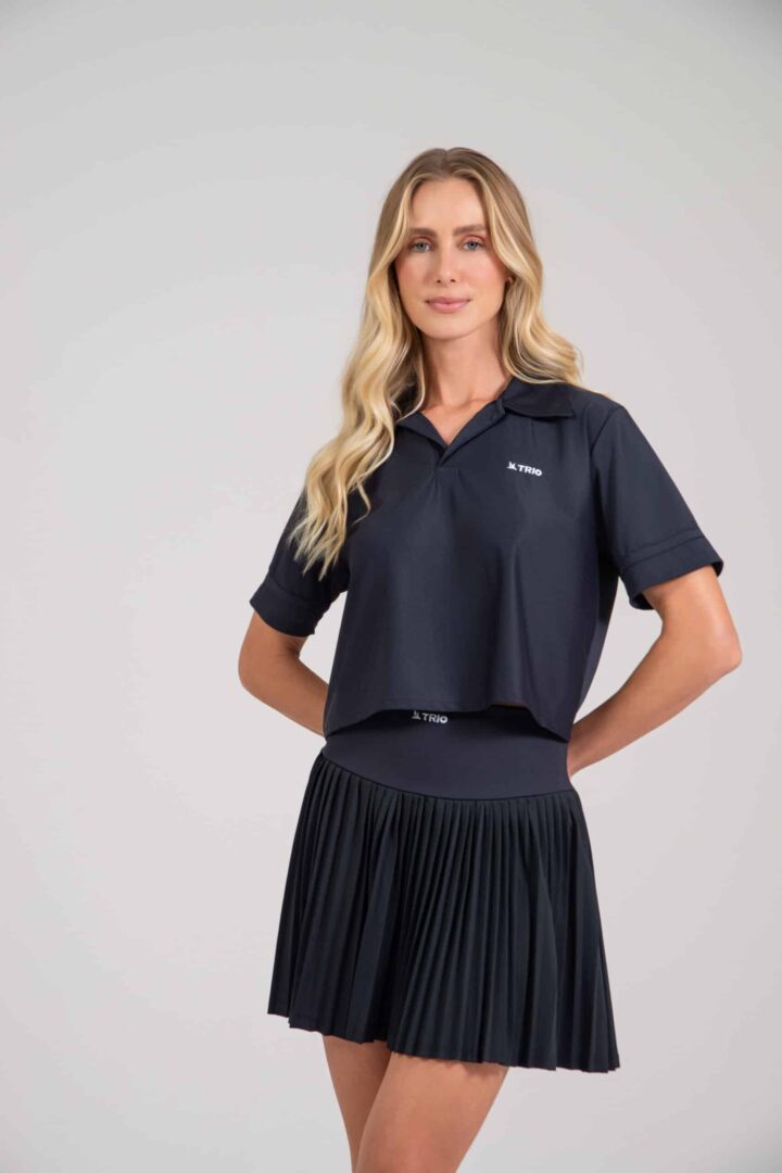 Inspirada na tendência tenniscore, com gola polo super feminina. Comprimento médio. Tecido respirável, com proteção UV50+ e toque super leve.