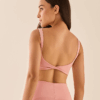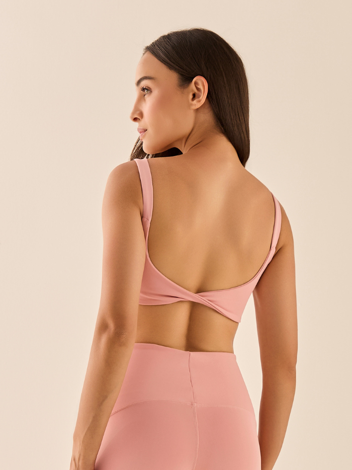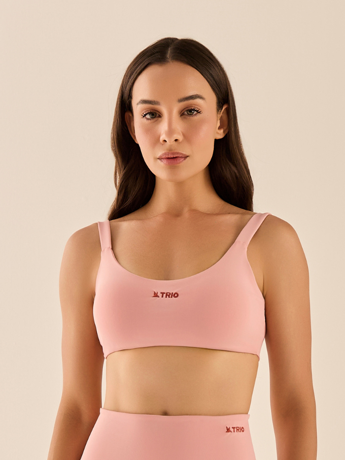 O Top Clarice tem alças largas com acabamento em elástico, oferecendo alta sustentação e conforto. O comprimento é curto e o detalhe torcido nas costas adiciona charme ao visual. Possui entrada para bojo e compressão firme.