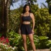 Tecido em poliamida, com proteção UV. Alta compressão e elasticidade, modela o corpo e é perfeito para exercícios de forte impacto.