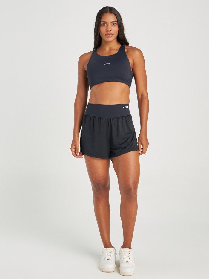 Tecido em poliamida, com proteção UV. Alta compressão e elasticidade, modela o corpo e é perfeito para exercícios de forte impacto.