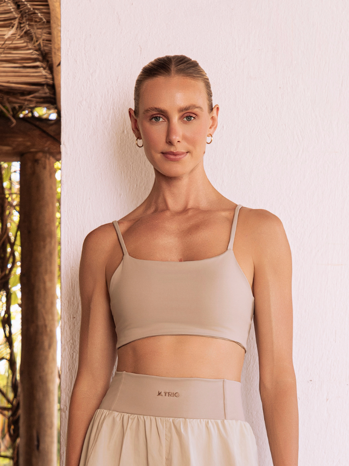 Top de modelagem reta com tecido duplo e alças finas elásticas. O design minimalista e delicado combina facilmente com diferentes produções fitness ou casuais. O tecido com tecnologia easy care tem toque gelado e baixa transparência, enquanto o tom neutro amplia as combinações possíveis.