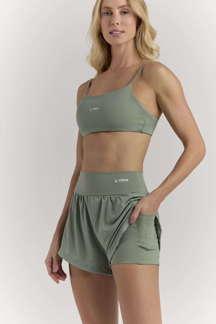 Tecido em poliamida, com proteção UV. Alta compressão e elasticidade, modela o corpo e é perfeito para exercícios de forte impacto.