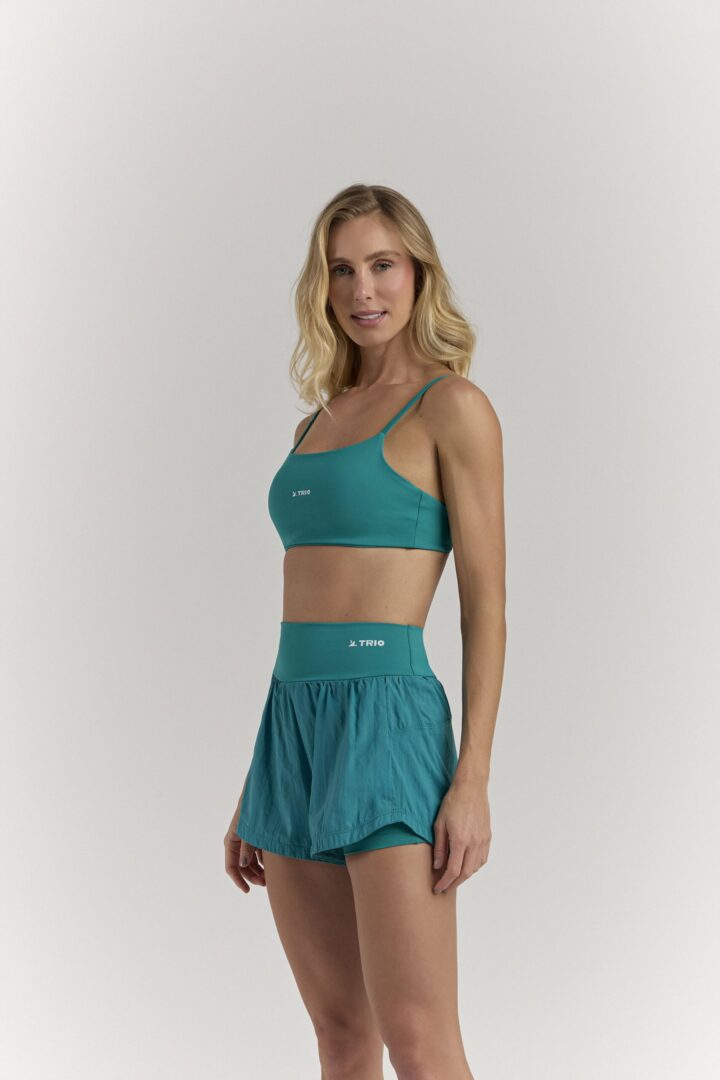 Tecido em poliamida, com proteção UV. Alta compressão e elasticidade, modela o corpo e é perfeito para exercícios de forte impacto.