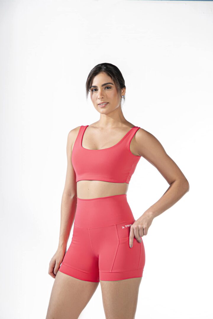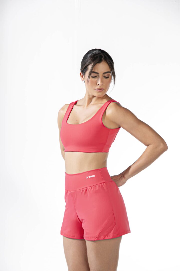 Tecido em poliamida, com proteção UV. Alta compressão e elasticidade, modela o corpo e é perfeito para exercícios de forte impacto.