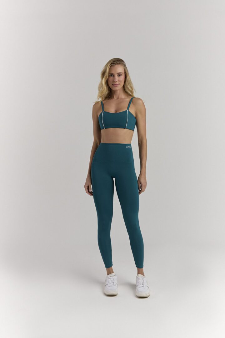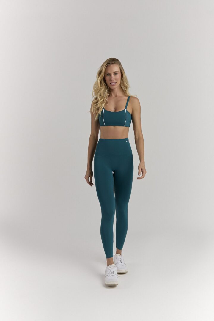 Tecido em poliamida, com proteção UV. Alta compressão e elasticidade, modela o corpo e é perfeito para exercícios de forte impacto.