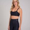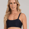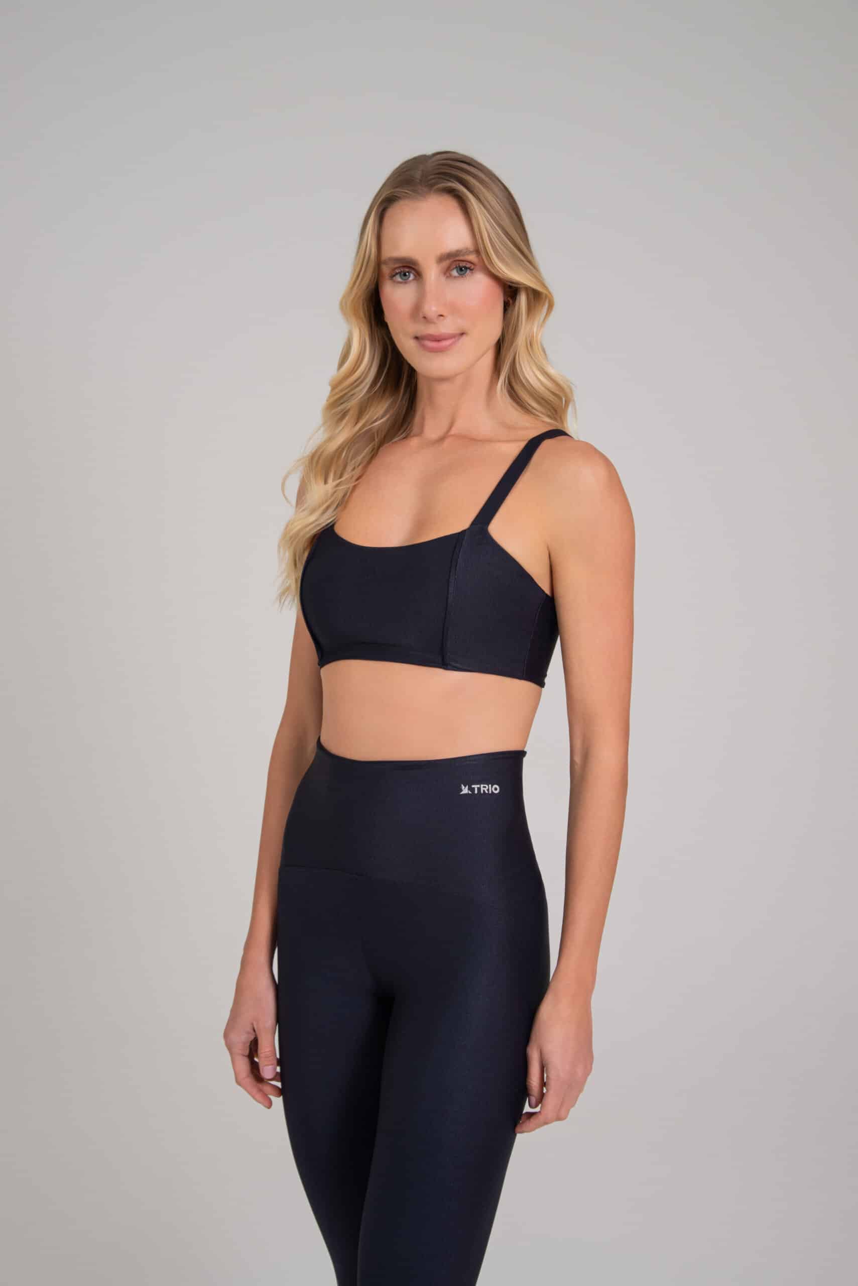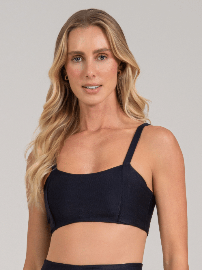 Comprimento curto, alças com acabamento em elástico para auxiliar na sustentação. Costuras frontais que modelam o busto. Forrado no mesmo tecido e possui entrada para bojo.