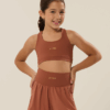 O top tem decote redondo, costas nadador e é confeccionado em poliamida com elastano, oferecendo sustentação leve, toque macio, boa compressão e proteção UV+ — ideal para atividades físicas e brincadeiras do dia a dia.