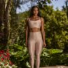 Tecido em poliamida com fio Lycra, confeccionado com tecnologia que reduz a fadiga muscular, elasticidade que se adequa as curvas do corpo e proporciona conforto durante os exercícios. Proteção UV e textura canelada com leve brilho.