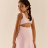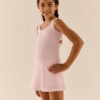 Possui alças largas, decote arredondado e detalhe vazado nas costas trazendo muita leveza. A saia com sobreposição traz fluidez ao visual e liberdade para brincar ou praticar esportes com conforto.