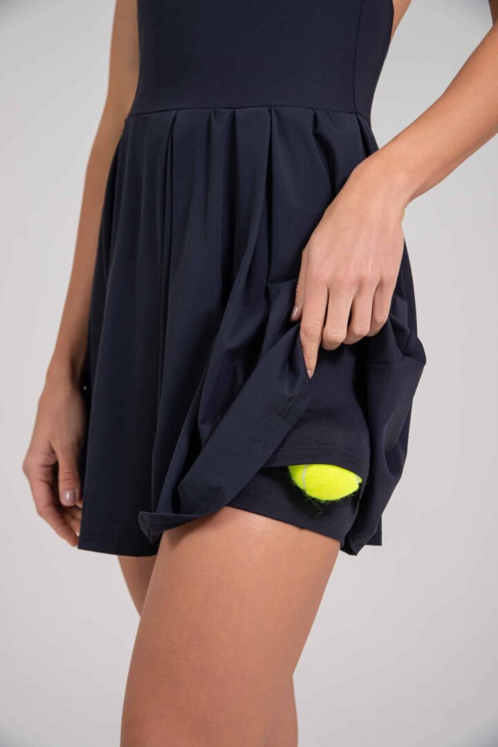 Alças com acabamento em elástico e busto forrado. Logomarca bordada. Saia em pregas dando todo o charme! Possui short de forro com dois bolsos: um com abertura para cima, para celular e acessórios; outro com abertura para baixo, para bolas.